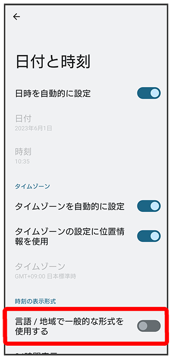 ユーザーの言語/地域の標準に従って24時間表示/12時間表示が自動設定されます。