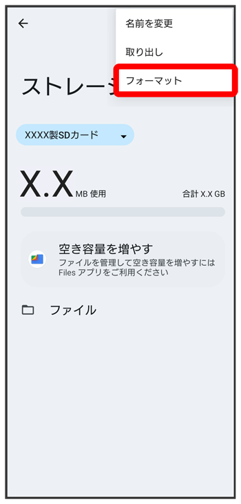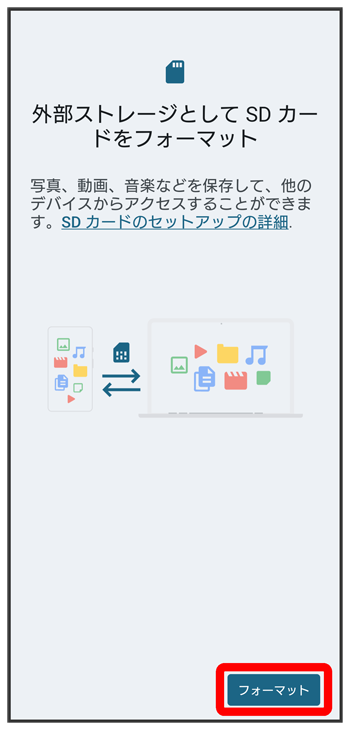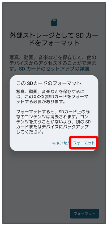 - フォーマットすると、SDカード内のデータがすべて消去されます。ほかの機器で使用したSDカードをフォーマットするときは、あらかじめよくご確認のうえ、操作してください。