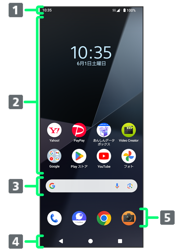 | カスタマイズエリア | アプリのショートカットやフォルダ、ウィジェットを自由に配置できます。 |