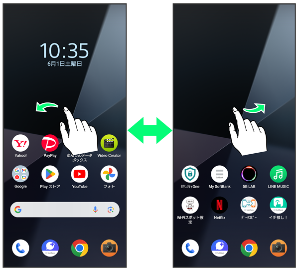各ホーム画面シートをアプリのショートカットやウィジェットなどでカスタマイズして、便利に使用できます。ホーム画面を左右にフリックすると、ホーム画面シートを切り替えることができます。
