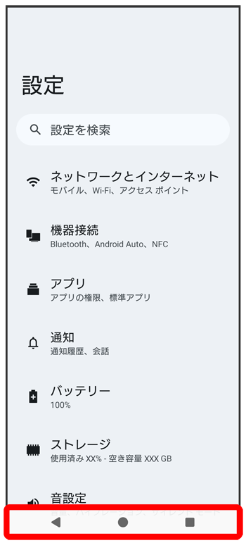 画面下部のアイコンが表示される領域を「ナビゲーションバー」と呼びます。アイコンをタップして操作できます。