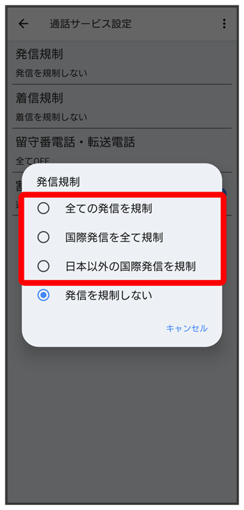 - 発信規制中に電話やSMSを発信しようとすると、発信できない旨のメッセージが表示されます。お客様がご利用になる地域によっては、表示されるまでに時間がかかることがあります。