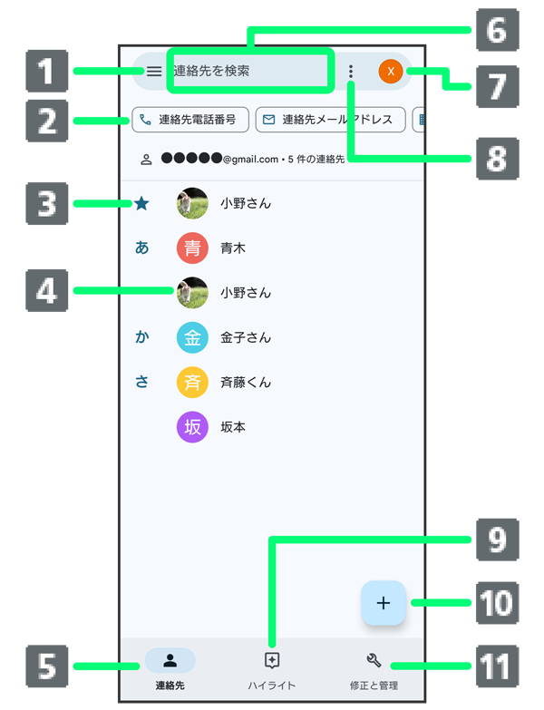 | フィルター | タップした項目に該当する連絡先が表示されます。 |