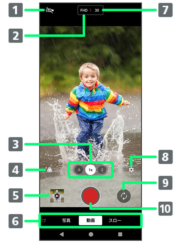 (2倍))をタップすると、レンズが切り替わり、ズーム倍率が変更されます。選択中のアイコンをタップすると、インジケータが表示され、左右(横画面の場合は上下)にドラッグするとズームを利用できます。 - タップすると、撮った写真/動画が表示されます。