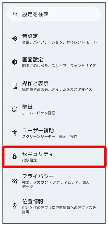 - 画面ロック解除方法を「パターン」/「ロックNo.」/「パスワード」に設定している場合は、画面ロック解除の入力画面が表示されます。画面ロック解除方法を入力し、手順