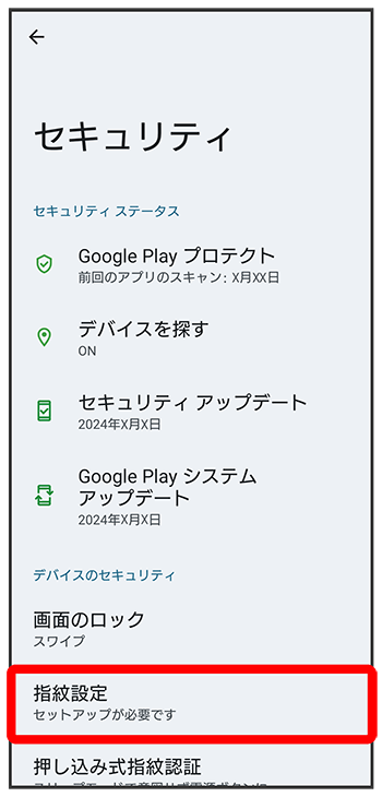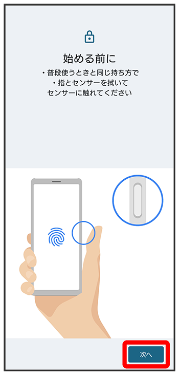 に進みます。 - 指紋を登録済みの場合は、画面ロック解除の入力画面が表示されます。画面ロック解除方法を入力し、をタップして手順