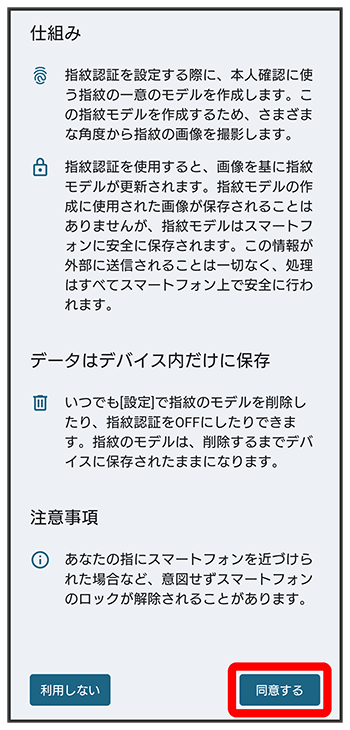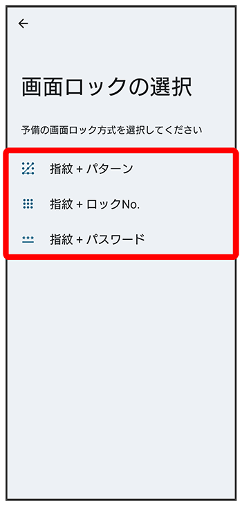 - 設定した画面ロック解除方法は、指紋認証を利用できない場合に使用します。