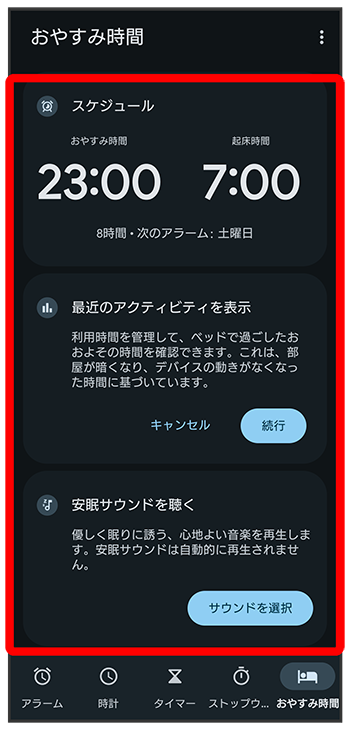 毎日の起床時間と就寝時間を設定して睡眠スケジュールを管理したり、快適な睡眠をサポートする機能を設定したりできます。