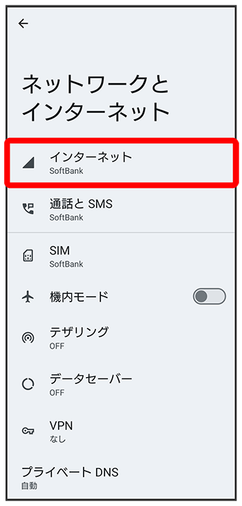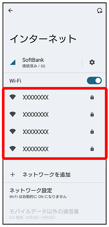 インターネット画面で設定したいネットワークをタップ- をタップするたびに、有効(