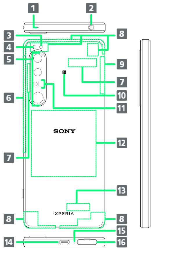 | 5G/4Gアンテナ部 | 通話やデータ通信を利用する際のアンテナが内蔵されています。 |