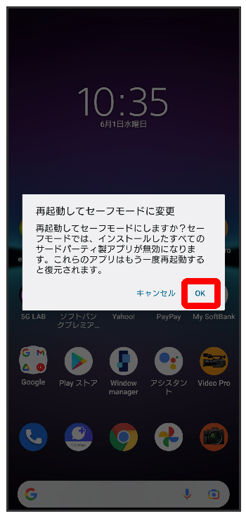 - セーフモードで電源を入れると、画面左下に「セーフモード」と表示されます。