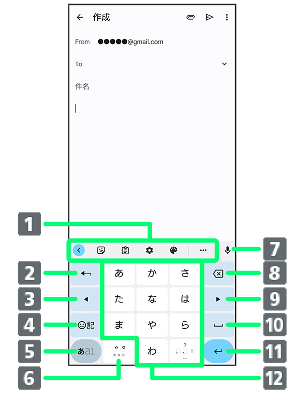 - 文字入力モードを切り替えます(かな/英字/数字)。ロングタッチすると文字入力の設定画面を表示したり、片手モードを設定したりできます。