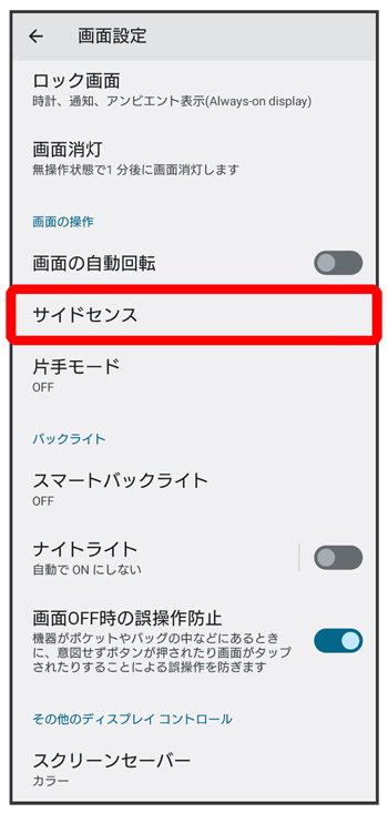 | ジェスチャー操作感度 | サイドセンスバーが認識するダブルタップ操作の速度や、スライド操作の長さを調節します。 |