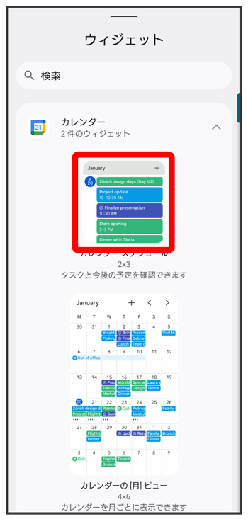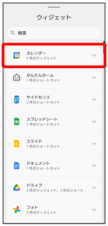 - 画面上部のウィジェット検索バーをタップカテゴリ/ウィジェットの名前を入力と操作すると、カテゴリやウィジェットを検索できます。