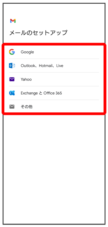 Gmailを利用するには、Google アカウントまたはeメールアカウントの設定が必要です。