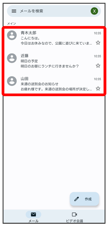 メール一覧画面で未読にするメールをロングタッチメールを削除する