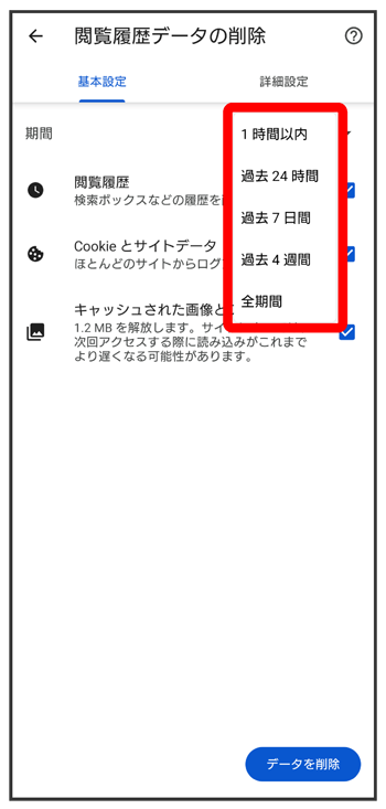 と操作しても閲覧履歴データの削除画面を表示できます。