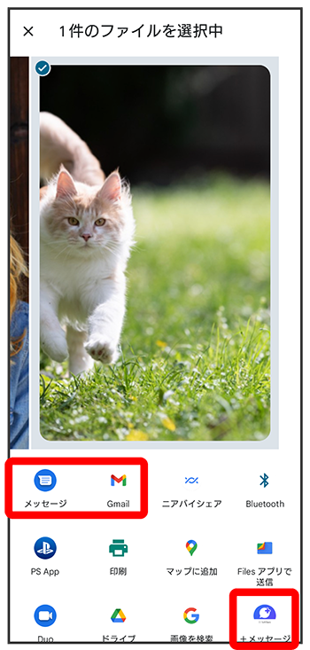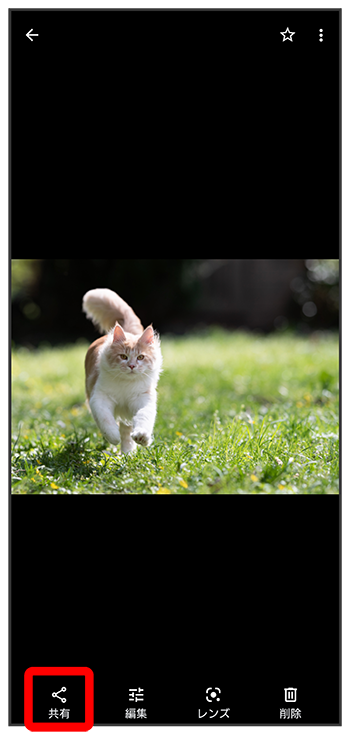 写真/動画一覧画面で写真/動画をタップ画面の指示に従って操作- Google アカウントにログインしている場合は、をタップすると共有できるすべてのアプリを表示させることができます。