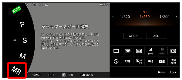 あらかじめ登録した撮影モードや設定を呼び出して撮影できます。詳しくは、「MRモード(メモリーリコールモード)に撮影モードや設定を登録する」を参照してください。