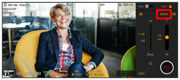 - オレンジ色の文字で表示されているパラメーターは調節することができます。Video Pro画面でパラメーターをタップして設定や数値を選択してください。