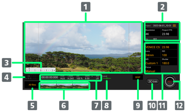 | オーディオレベルメーター | 音声レベルを確認できます。 タップするとCinema Proのメニューの「Audio settings」が表示されます。 |