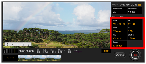 | Lens | レンズ(16mm F2.2/24mm F1.7/85-125mm F2.3-2.8)を切り替えられます。 ・「85-125mm F2.3-2.8」を選択すると、ズームのスライダーが表示され、光学ズームが使用できます。 |