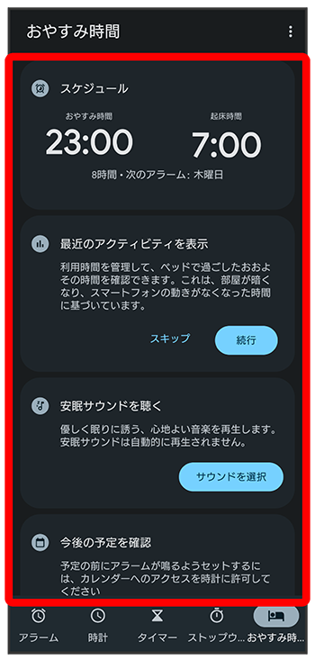 - スケジュールの起床時間を設定すると、起床時間がアラームに設定されます。