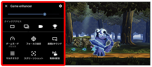 はドラッグしてお好みの位置に配置できます。 - Game enhancer使用中は、がOFFになります。詳しくは、「STAMINAモードを利用する」を参照してください。電池残量を優先する場合は、ゲーム中に