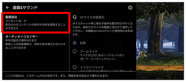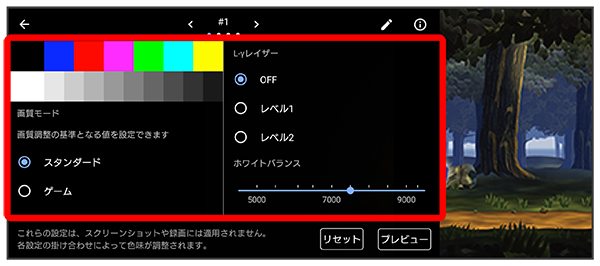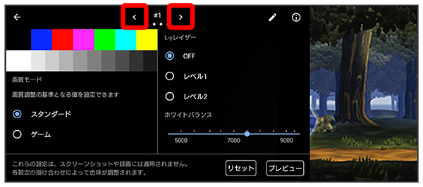 画質設定を4つまでプリセットできます。ゲームの状況に応じてプリセットを選択して、画面の色味や効果を調整することができます。