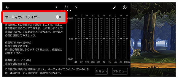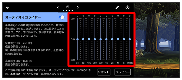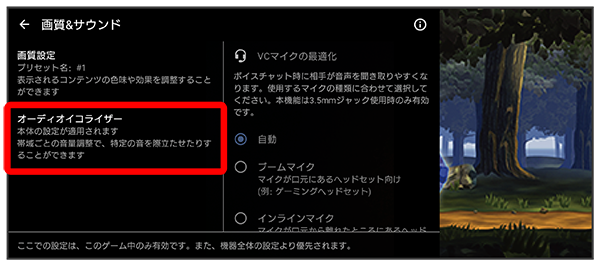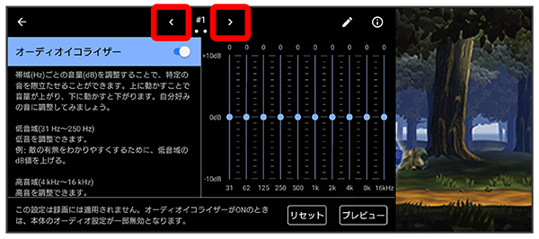オーディオイコライザーの設定を4つまでプリセットできます。ゲームの状況に応じてプリセットを選択して、音を調整することができます。