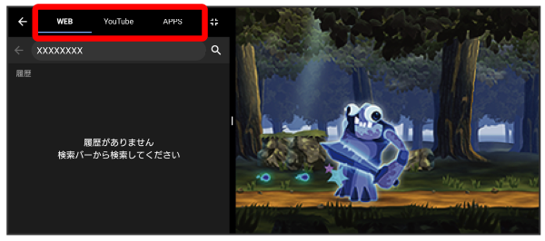 をタップします。 - 「APPS」タブでアプリをタップすると、ポップアップウィンドウでアプリが表示されます。ポップアップウィンドウをタップすると、操作アイコンが表示されます。詳しくは、「APPS画面(ポップアップウィンドウ)の見かた」を参照してください。