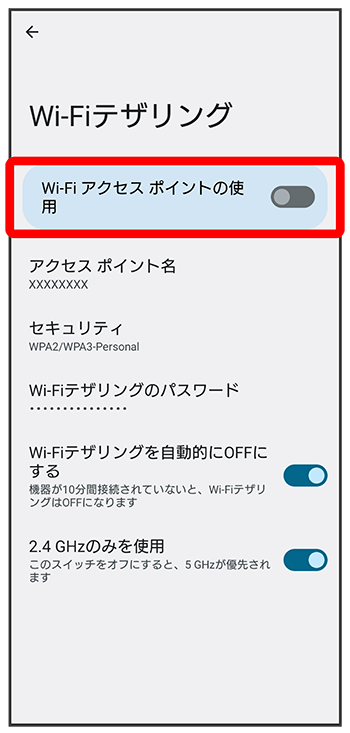 テザリング画面で「アクセス ポイント名」、「セキュリティ」、「Wi-Fiテザリングのパスワード」などを画面に従って設定