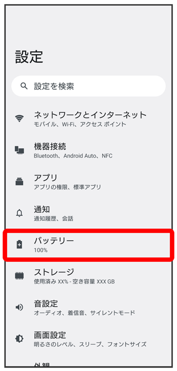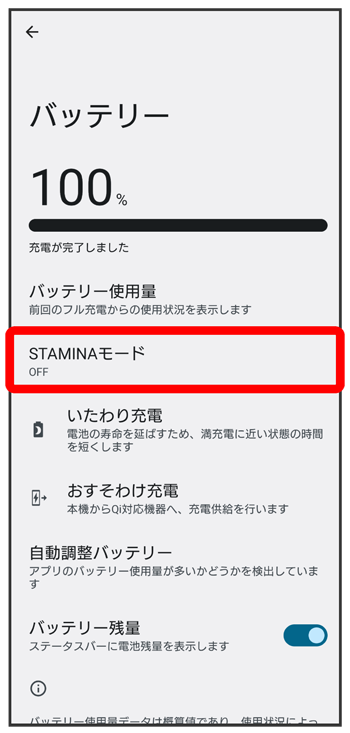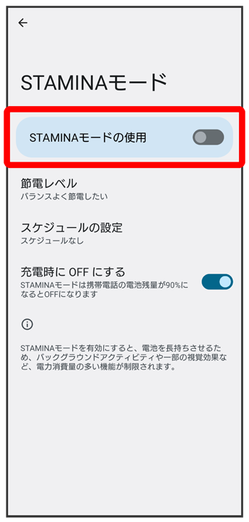 に変わります。また、ダークモードが有効になります。 - と操作すると、設定した電池残量に応じてSTAMINAモードをONにするように設定できます。