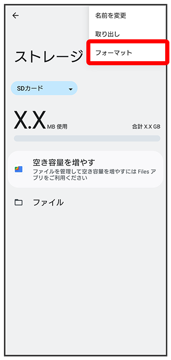 - フォーマットすると、SDカード内のデータがすべて消去されます。ほかの機器で使用したSDカードをフォーマットするときは、あらかじめよくご確認のうえ、操作してください。