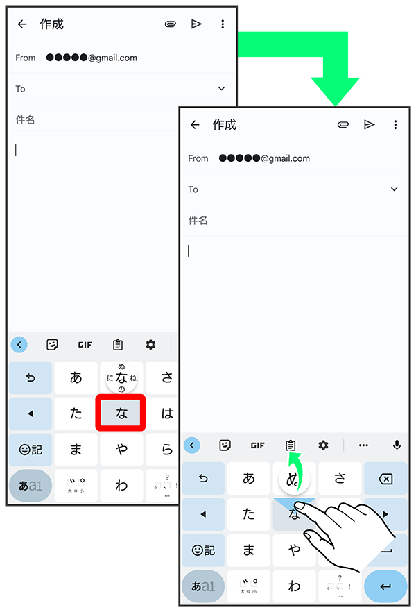 キーを上下左右にフリックすることで、キーを繰り返しタップすることなく、入力したい文字を入力できます。キーに触れると、フリック入力で入力できる候補が表示されます。入力したい文字が表示されている方向にフリックすると、文字が入力されます。