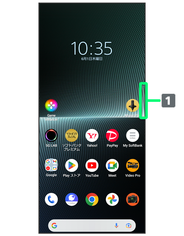 サイドセンスバーをダブルタップするとサイドセンスメニューが表示されます。アプリの起動などができます。表示するアプリはカスタマイズできます。サイドセンスメニューについて詳しくは、「サイドセンスメニューを利用する」を参照してください。 - バック操作