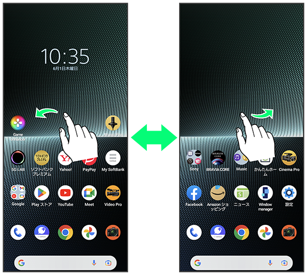 各ホーム画面シートをアプリのショートカットやウィジェットなどでカスタマイズして、便利に使用できます。ホーム画面を左右にフリックすると、ホーム画面シートを切り替えることができます。