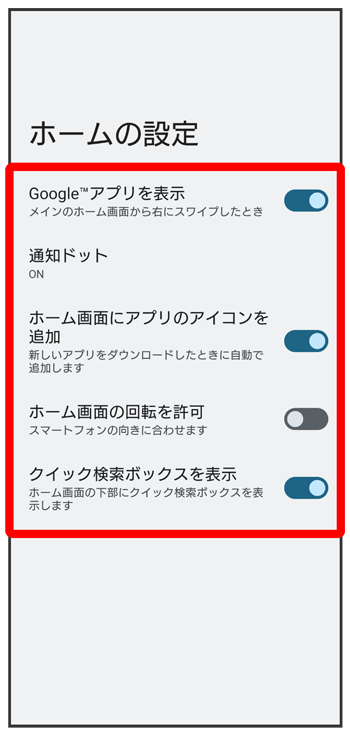 | クイック検索ボックスを表示 | ホーム画面の下部にクイック検索ボックスを表示するかどうかを設定します。アプリや入力した語句を |