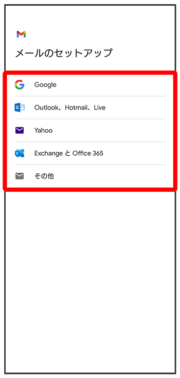 Gmailを利用するには、Google アカウントまたはeメールアカウントの設定が必要です。