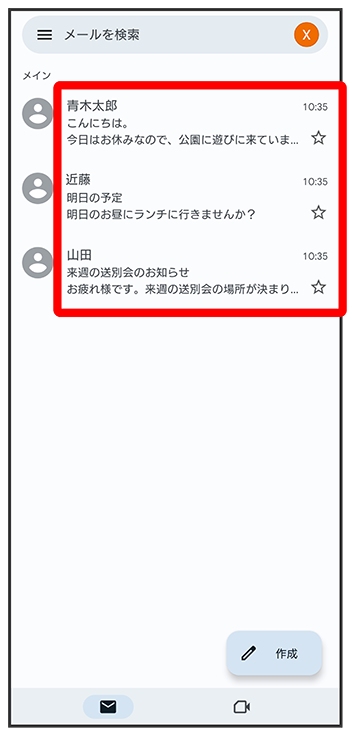 メール一覧画面で未読にするメールをロングタッチメールを削除する