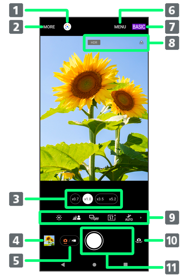 (望遠レンズ))をタップすると、レンズが切り替わり、ズームインジケーターが表示されます。アイコンを左右(横画面の場合は上下)にドラッグするとズームを利用できます。 - タップすると、撮った写真/動画が表示されます。