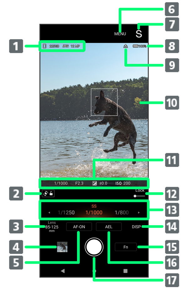 | Lens | タップすると、レンズ(16mm/24mm/85mm-125mm)を切り替えられます。 レンズ名の上のズームスライダを左右にドラッグすると、ズームを調節できます。音量キーや画面のピンチでもズームを調節できます。 |