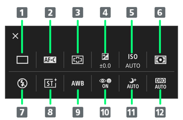 | クリエイティブルック | 写真の仕上がりをお好みで選択できます。 「ST」「NT」「VV」「FL」「IN」「SH」から選択します。 ・ |