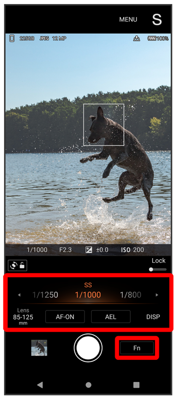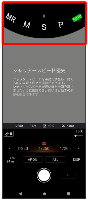 - 「S(シャッタースピード優先)」:シャッタースピードを手動で調整し、動く被写体の表現を変えて撮影できます。Sモードに設定するとISO感度が「AUTO」に設定されます。