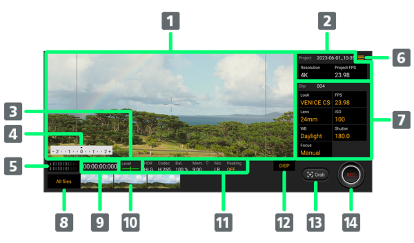 | オーディオレベルメーター | 音声レベルを確認できます。 タップするとCinema Proのメニューの「Audio settings」が表示されます。 |