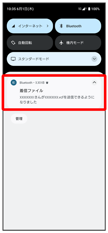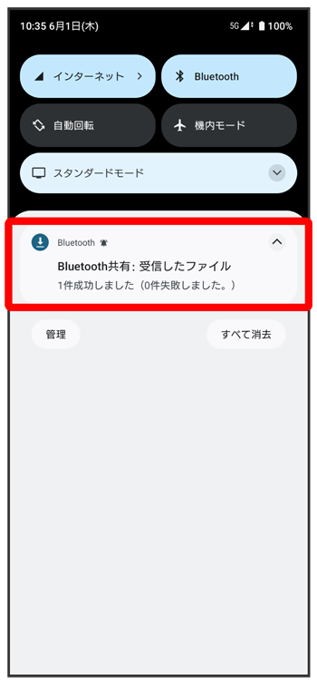 受信完了後、ステータスバーを下にフリックファイル受信の通知をタップ