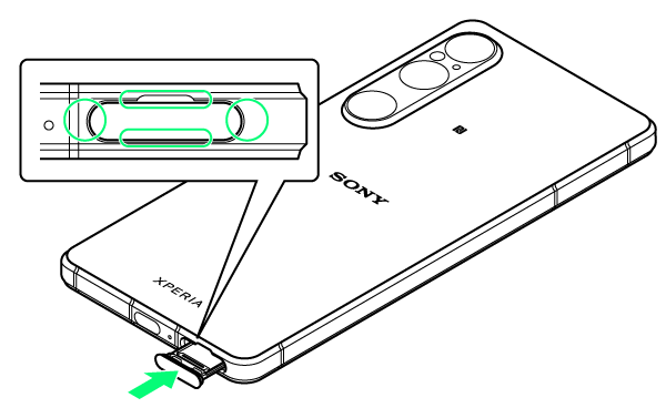 - ○部分をしっかりと押し、本体とSIMカード/SDカード挿入口のカバーにすき間がないことを確認してください。