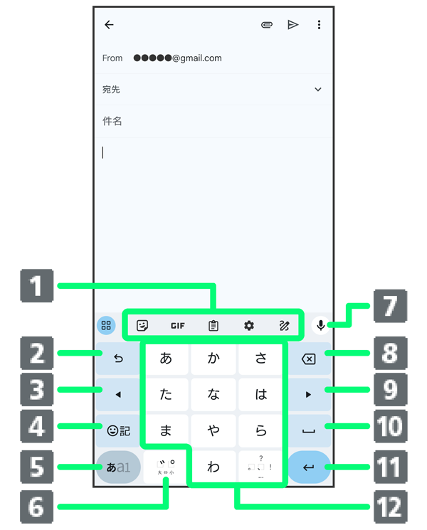 - 文字入力モードを切り替えます(かな/英字/数字)。ロングタッチすると文字入力の設定画面を表示したり、片手モードを設定したりできます。