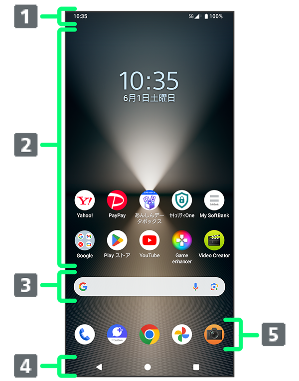 | カスタマイズエリア | アプリのショートカットやフォルダ、ウィジェットを自由に配置できます。 |