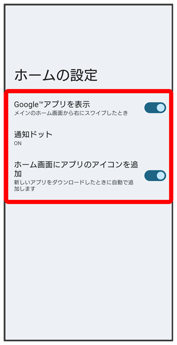| ホーム画面にアプリのアイコンを追加 | 新しいアプリをダウンロードしたときにホーム画面にアプリのアイコンを追加するかどうかを設定します。 |